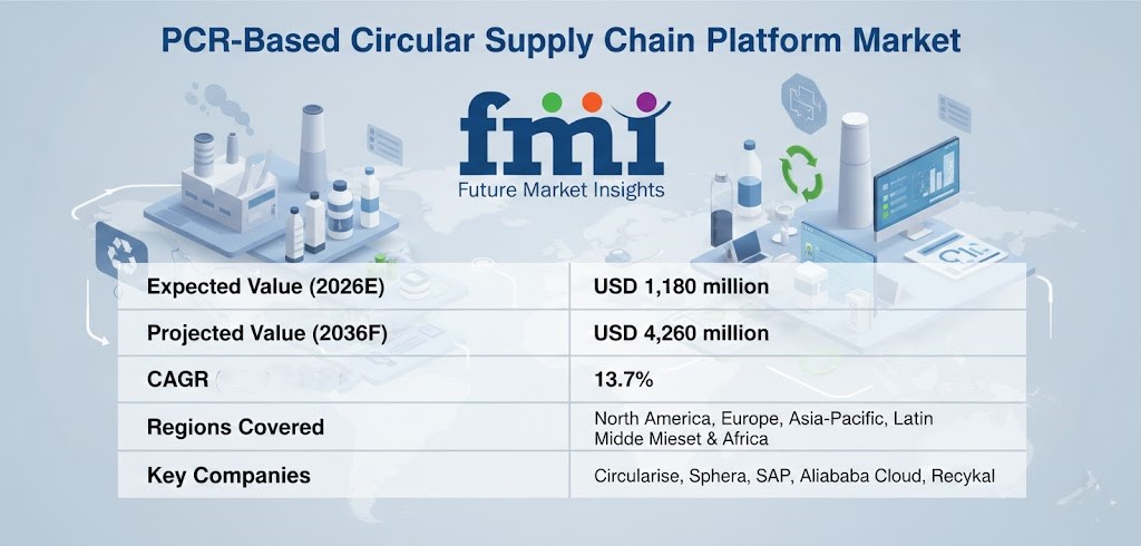 NEWARK, DE, UNITED STATES, February 16, 2026 /EINPresswire.com/ -- The global PCR-Based Circular Supply Chain Platform Market is projected to grow from USD 1,180 million in 2026 to USD 4,260 million by 2036, expanding at a CAGR of 13.7%. This growth reflects the market’s evolution from pilot-scale traceability initiatives to enterprise-grade systems designed for compliance, operational efficiency, and verified circular sourcing. As digital product passport requirements and enterprise sustainability mandates gain traction, these platforms are becoming essential infrastructure for managing post-consumer recycled materials across complex supply networks.
